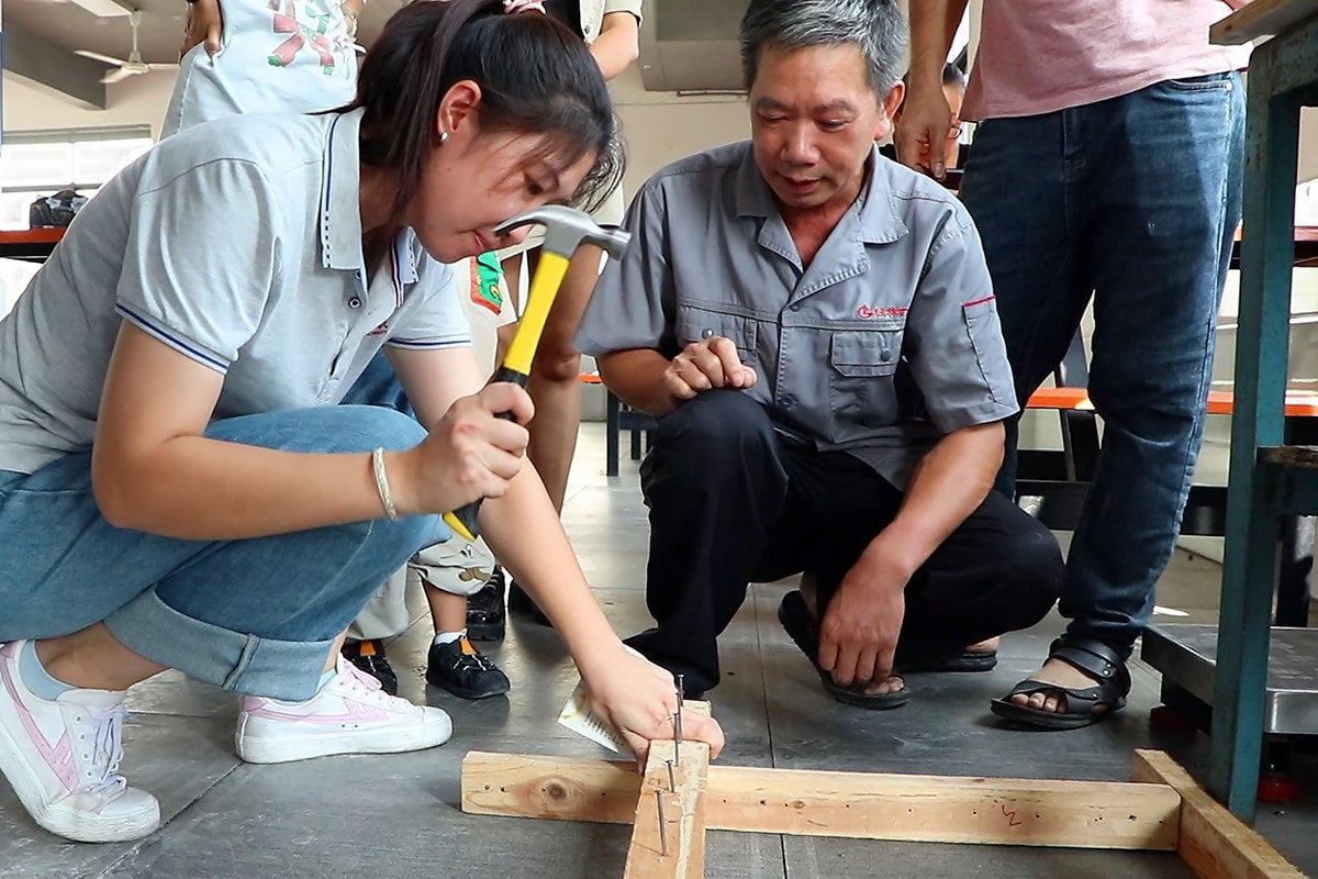 敲釘子活動則是對參與者動手能力的一次考驗。員工們需要在規(guī)定次數(shù)內(nèi)將釘子完全敲入木板,成功者可獲得兩枚印章。雖然看似簡單,但實際操作中需要相當?shù)募记膳c專注力,不少經(jīng)驗豐富的一線男員工紛紛失手,不是敲空,就是打歪。相反女員工收獲滿滿,一錘入木三分,兩錘手到擒來。