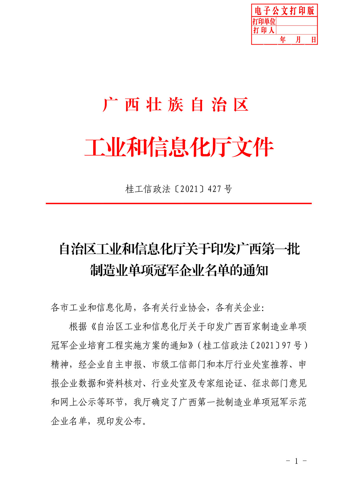 日前,自治區(qū)工業(yè)和信息化廳關(guān)于印發(fā)廣西第一批制造業(yè)單項冠軍企業(yè)名單的通知,確定了桂林礦機等42家企業(yè)成功入選廣西第一批制造業(yè)單項冠軍示范企業(yè)。