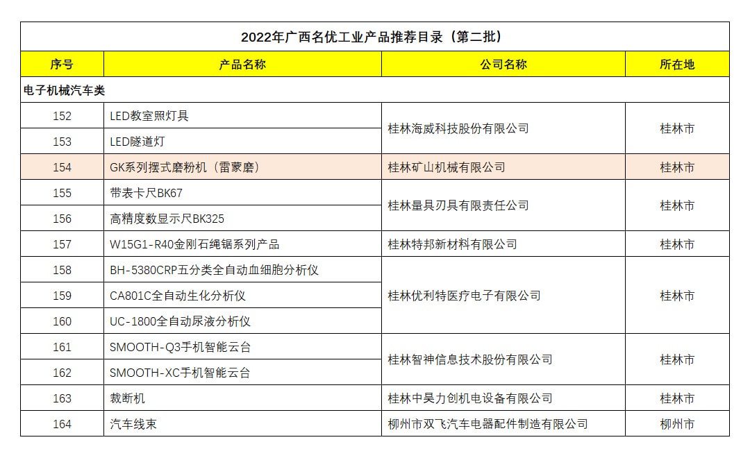 日前,通過自治區(qū)工業(yè)和信息化廳發(fā)布關(guān)于廣西名優(yōu)工業(yè)產(chǎn)品推薦目錄(第二批)的公示,桂林礦山機(jī)械有限公司擺式磨粉機(jī)產(chǎn)品成功入選《廣西名優(yōu)工業(yè)產(chǎn)品推薦目錄》(第二批)。