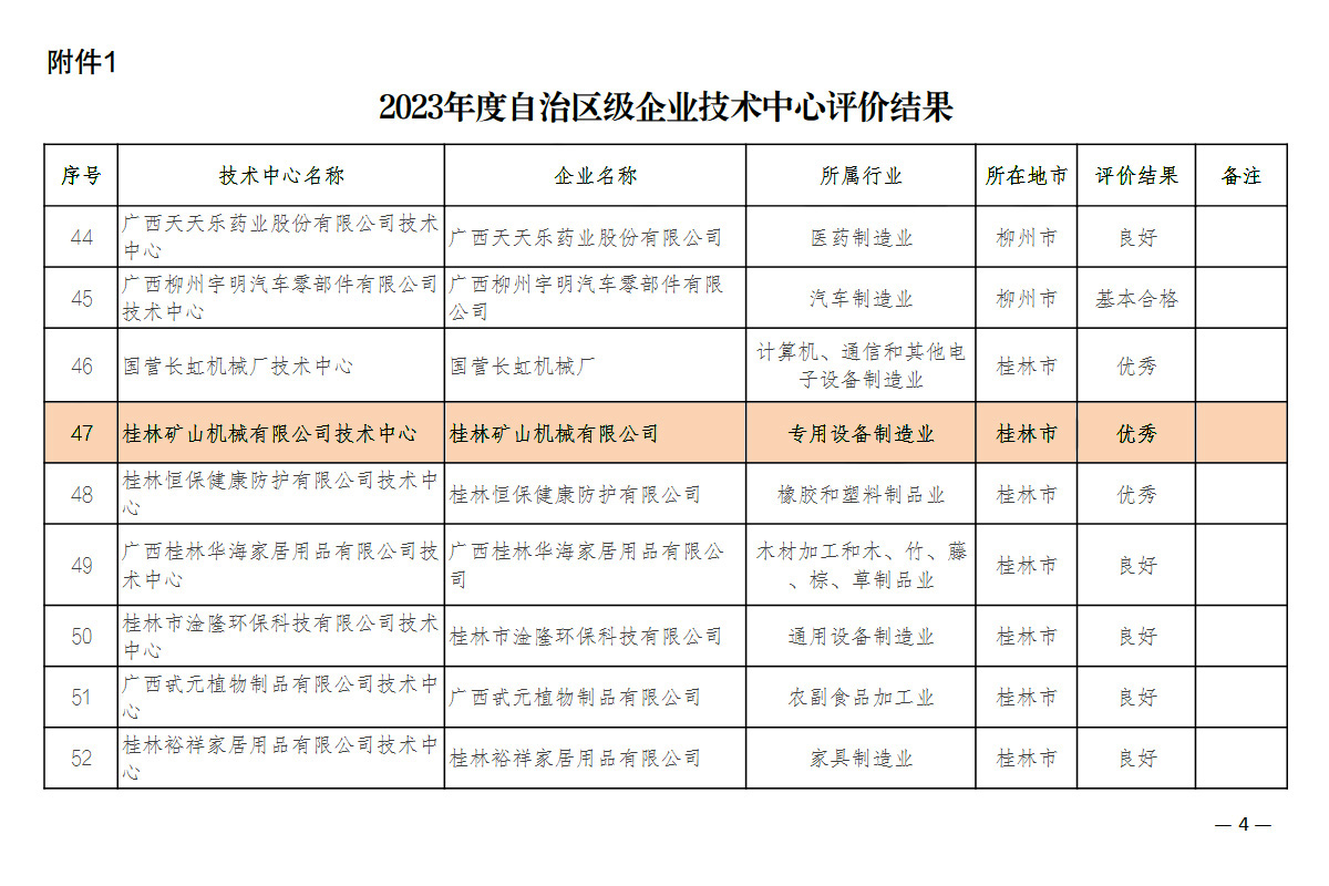 6月27日,自治區(qū)工業(yè)和信息化廳公布2023年自治區(qū)級(jí)企業(yè)技術(shù)中心評(píng)價(jià)結(jié)果的通知,根據(jù)《廣西壯族自治區(qū)認(rèn)定企業(yè)技術(shù)中心管理辦法》(桂工信科技〔2018〕228號(hào))有關(guān)規(guī)定,對(duì)2017年、2019年、2021年獲認(rèn)定的自治區(qū)級(jí)企業(yè)技術(shù)中心組織開(kāi)展了復(fù)核評(píng)價(jià),符合此次評(píng)價(jià)年限的自治區(qū)級(jí)企業(yè)技術(shù)中心共有94家,其中89家提交了評(píng)價(jià)材料,5家企業(yè)技術(shù)中心因經(jīng)營(yíng)困難或者企業(yè)重組等原因申請(qǐng)暫緩評(píng)價(jià)。89家提交材料的企業(yè)技術(shù)中心評(píng)價(jià)結(jié)果:優(yōu)秀(90分以上)27家、良好(65-90分)53家、基本合格(60-65分)9家。桂林礦山機(jī)械有限公司憑借在科技創(chuàng)新能力、新產(chǎn)品研發(fā)等方面較大的優(yōu)勢(shì),以?xún)?yōu)秀成績(jī)通過(guò)2023年復(fù)核評(píng)價(jià)。