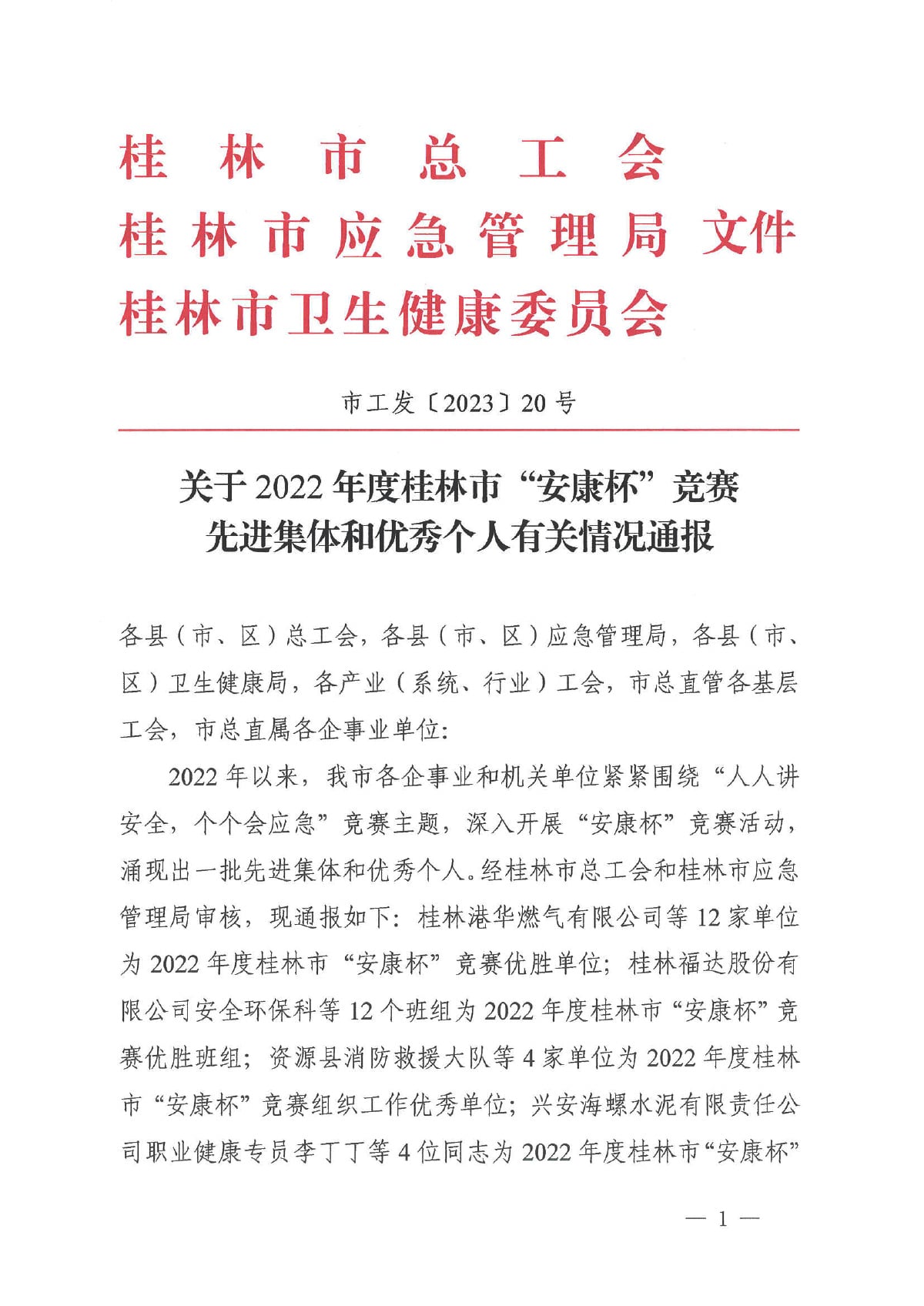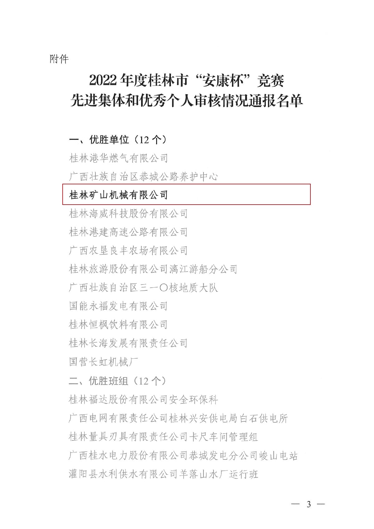 正是基于這樣的努力和付出,桂林礦機(jī)在“安康杯”競(jìng)賽中取得了優(yōu)異的成績(jī)。經(jīng)過(guò)桂林市總工會(huì)和桂林市應(yīng)急管理局的嚴(yán)格審核和評(píng)比,桂林礦機(jī)憑借其出色的表現(xiàn)和安全管理的卓越成果,榮獲了優(yōu)勝單位的稱號(hào)。