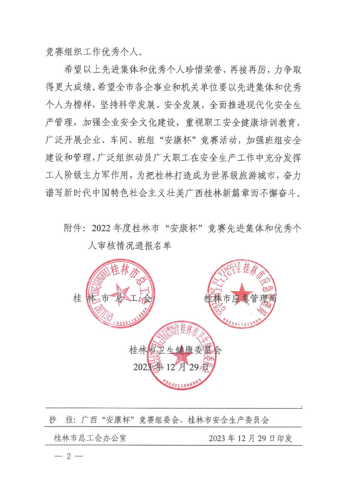 2022年以來(lái),桂林市各企事業(yè)和機(jī)關(guān)單位積極響應(yīng)號(hào)召,深入開展了以“人人講安全,個(gè)個(gè)會(huì)應(yīng)急”為主題的“安康杯”競(jìng)賽活動(dòng)。在這場(chǎng)旨在提升安全意識(shí)、增強(qiáng)應(yīng)急能力的競(jìng)賽中,桂林礦山機(jī)械有限公司(以下簡(jiǎn)稱桂林礦機(jī))以其卓越的表現(xiàn)和突出的成績(jī),榮獲2022年度桂林市“安康杯”競(jìng)賽先進(jìn)集體殊榮。